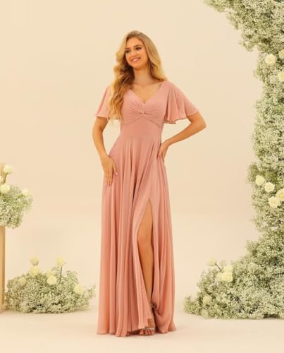 More information about Miao Duo Flutter Sleeves Split Bridesmaid Dresses with Slit Long V Neck Empire Waist Formal Dress for Women Wedding YZTS113
