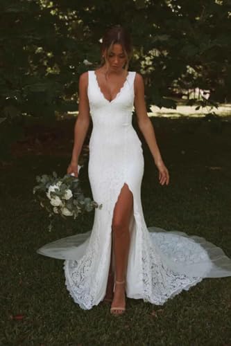 Lace Appliques Wedding Dresses with Slit for Bride V Neck Mermaid Beach Bridal Gowns for Women 5