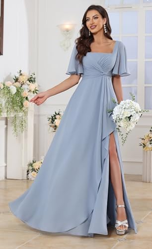 Square Neck Flutter Sleeve Bridesmaid Dresses for Women Long Slit A Line Chiffon Formal Evening Gown 5