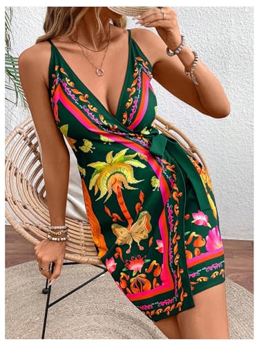 Women's Tropical Print Cami Dress Sleeveless Wrap V Neck Tie Knot Boho Short Dresses 1