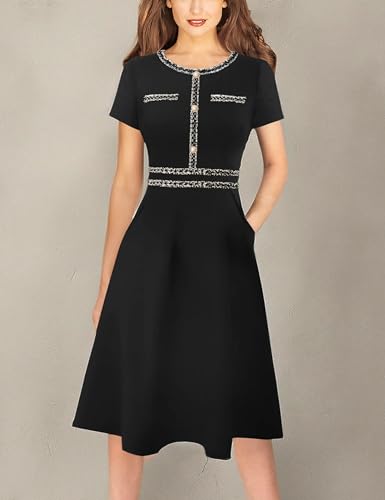 • Style: Crew Neckline, Short Sleeve, Front unmovable Buttons, Two Handy Pockets, Colorblock Tweed Trim with Golden Metallic Stitching Detail, Slim Fitted, Knee Length, A Concealed Back Zipper, A-Line Silhouette helps hide body imperfection well.