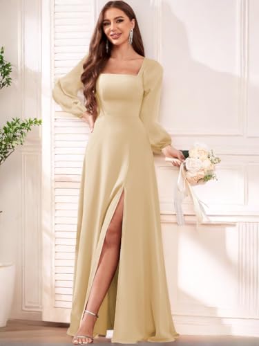 HOT ! Women's Long Sleeve Bridesmaid Dresses with Slit A Line Square Neck Chiffon Formal Dress for Wedding