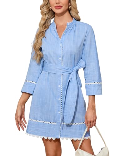 Women's Button Down Shirt Dress Fall 3/4 Sleeve Belted Tunic Casual Cotton Linen RIC Rac Trim Mini Dresses with Pockets 3