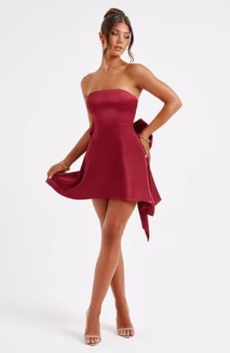 A Line Strapless Short Homecoming Dresses for Teens with Pockets Satin Cocktail Party Gowns for Women with Bow 4