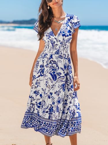 • Design: The casual summer midi dress is a flattering choice for any occasion! Featuring a v neckline, cap sleeves, floral printed, and a smocked waist, ruffled hem, this midi dress combines a feminine silhouette with a relaxed fit