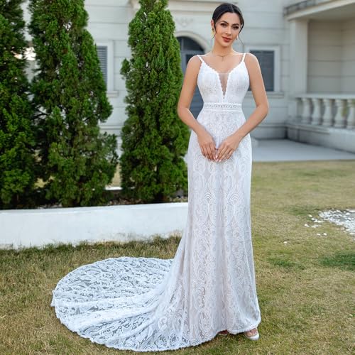 WIOJEIGO Women's Lace Boho Wedding Dress 2025 for Bride Spaghetti Straps Bohemian Long Mermaid Beach Bridal Gowns 6
