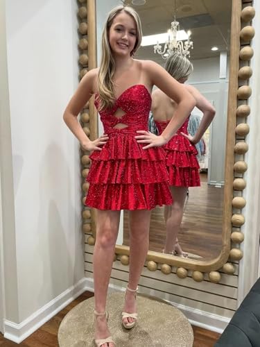 • This short sparkly homecoming dress features strapless,cut out,tiered sequin,sweetheart,a line,empire waist, adjustable lace-up back, built-in bra, fully Lined