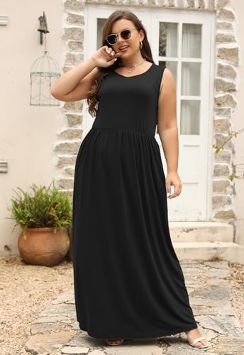 • Features: Sleeveless,Casual Simple Style,Two Side Pockets,Round Neck,Floor Length,Elastic at Waist,Not lined,Plus Size Maxi Dresses