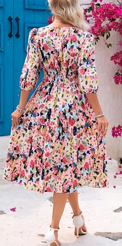Kormei Women Casual Boho Floral Round Neck 3/4 Sleeve Smocked Waist Tiered A Line Flowy Swing Midi Dress Long Dresses 3