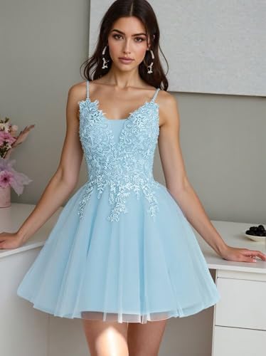 • Features: Tulle short homecoming dresses for teens lace appliques a-line Spaghetti Straps sleeveless elegant tulle v-neck lace up back formal evening party dress 2025 for teens sleeveless short cocktail graduation gowns.