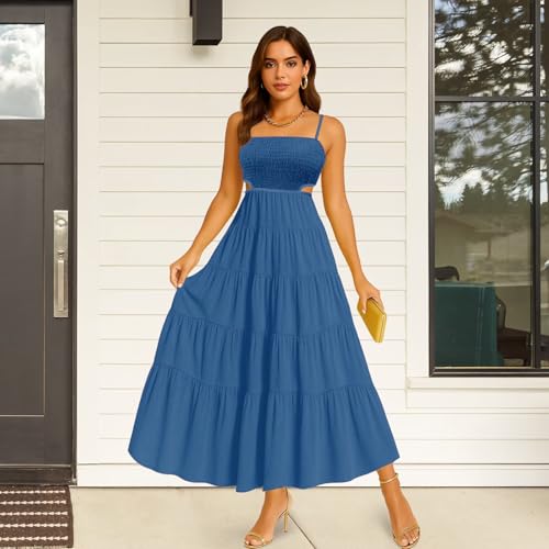 Womens Spaghetti Strap Sundress Casual Summer Long Maxi Dress Smocked A Line Swing Cocktail Party Vacation Dresses 4