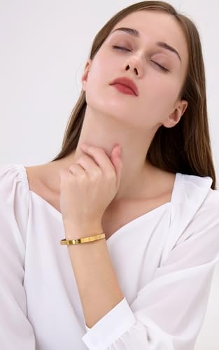 • 3. 【 Ideal Size】 The inner circumference of the gold bracelet is (16-17cm)(17-18)(18-19), the width is 6mm, and the inner diameter is approximately(2.21 X 1.93)(2.37 X 1.97)(2.52 X 2.13)inches, suitable for wrist sizes from 5.7" to 6.9". In addition, this love bangle is not too heavy but also not too light, great everyday accessory to add a little style to your outfit. Tips: To determine your bracelet size, we strongly advise that you measure the size of your wrist before purchasing.