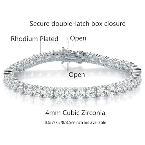 18k White Gold Plated CZ Tennis Bracelet, 4MM Cubic Zirconia Charm Bracelet for Women Men 6