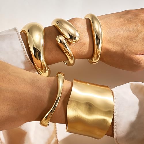 • GOLDEN CHUNKY BANGLES SET: Golden cuff bracelets fit for your wrists, featuring during an open and hinge design to open the cuff bracelets. The wide cuff style gives off a luxurious and trendy vibe that elevates any outfit. These unique golden chunky bracelets can be worn together or alone