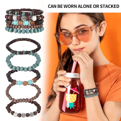 5pcs Life Tree Beaded Bracelets for Women, Multilayer Boho Bracelets Stackable Handmade Wood & Alloy Bead Elastic Bracelet Jewelry Gifts for Women Men 7