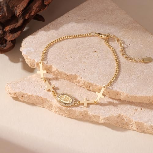 14K Gold Plated Virgin Mary Cross Bracelet for Women catholic bracelets Confirmation Gifts with Sparkling Zircon Stones religious bracelets first communion gifts 6