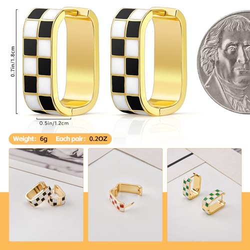 • Trendy Design: The checkered jewelry on gold rectangular hoops delivers a modern twist. Multicolor enamel options (black, green, red) effortlessly complement casual, office, or evening outfits