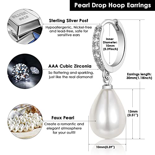 CERSLIMO Pearl Drop Earrings for Women | S925 Sterling Silver Post Simulated Shell Pearl Hoop Dangle Earrings, Hypoallergenic Cubic Zirconia Huggies Earrings Bridesmaid Jewelry 6