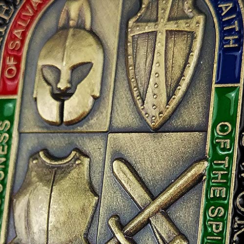 • Picture shows 2 sides of one coin. One side features a warrior of god and Ephesians 6:13-17.