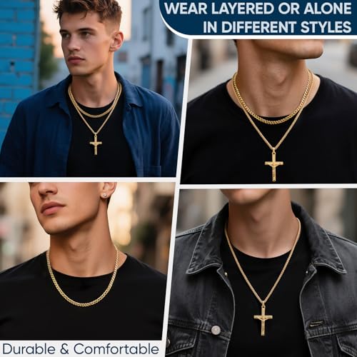 • 【Material Size】At 19 inches (3mm), the basketweave chain shows intricate details. Measuring 17 inches (5mm), the six-sided faceted chain has a modern edge. Stainless steel cross necklace for men, this men’s multi-layer cross necklace offers unbeatable durability. Resistant to corrosion and oxidation, it’s nickel- and lead-free, ensuring zero irritation—even for all-day wear. Wear them separately or layer them up; their lightweight design guarantees comfort from morning meetings to evening outings.