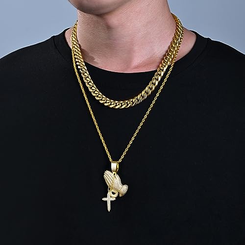 • Material& Size :High quality stainless steel rope chain with iced out 14k gold/white gold plated bling praying hands over fine brass pendant. Rope chain length: 24inch, chain width: 2.5mm;Big pendant size: 2.5*1.4inch.Small pendant size:1.46*0.83 inch. Two sizes of pendants are available to match your style, both sizes retain the iconic praying hands and cross pattern, ensuring that this tranquil prayer necklace is suitable for any outfit, unisex, whether worn as a stack or alone.