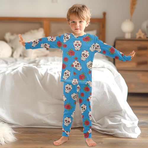 Pajama Sets Long Sleeve Sugar Skulls Roses on Blue Soft Comfy Sleepwear 2 Piece PJS 3-8T 4