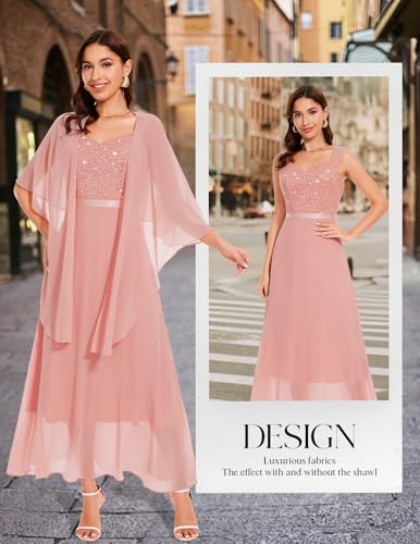 • ELEGANT TWO PIECE FORMAL DRESS: Includes sparkling long sequin dress and lightweight chiffon shawl. This elegant ladies formal dress is made of soft and comfortable fabric, ankle length and lightweight so you can enjoy your event with confidence and grace. The shawl is perfect, lightweight and elegant, it drapes beautifully and covers your arms. Perfect for a wedding or formal event.