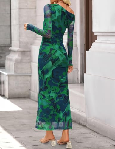 ZESICA Women's Long Sleeve Floral Maxi Dress 2025 Fall Off Shoulder Bodycon Ruched Mesh Cocktail Wedding Guest Dresses 2