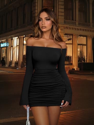 • 2.Feature: This long sleeve mini dress features an elegant and fashionable off-shoulder design. Its slim-fitted, tight cut with ruched detailing beautifully shows off your collarbone and shoulder curves. This classic piece is a party must-have little black dress. Ideal for: party wear, going out, mini dresses, off-shoulder styles.