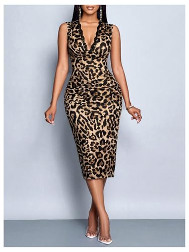 GORGLITTER Women's Cheetah Leopard Print Dress Lace Slit Ruched Sleeveless Y2K Bodycon Midi Dresses 1