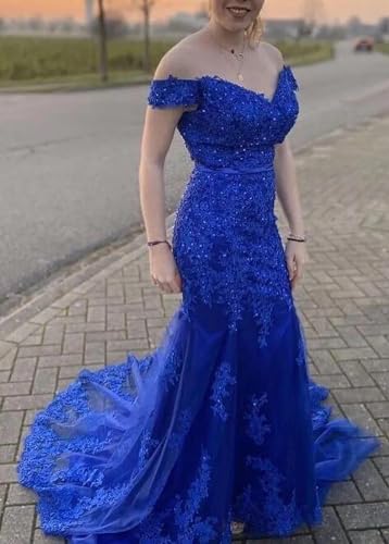 Lace Beaded Tulle Long Evening Dress Off Shoulder Mermaid Formal Party Gown 7