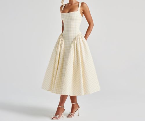 HOT ! Summer Gingham Long Dress Corset Square Neck Lace Up Casual Sundress Backless A Line Short Dresses for Women