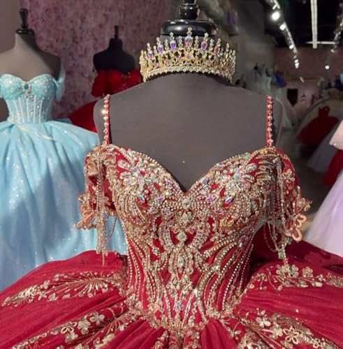 • Design: Spaghetti straps quinceanera dresses ball gown with gold appliques and big bow,off shoulder sweet 16 dresseswith tail, gorgeous beaded 15 dresses for quinceanera, princess xv dresses long puffy dama dress,pretty long prom dress tulle ball gown for womens formal party,gold appliques pageant dress.Kindly note:The model in the picture wears underskirt.If you want to achieve the same look as the picture, you can wear a underskirt too.