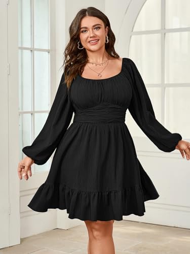 More information about Womens Plus Size Dress Casual Long Lantern Sleeve Square Neck Textured Ruffle Flowy Ruched A-Line Mini Dresses for Women