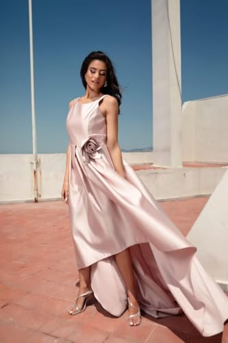 More information about 3D Flower Satin Mother of The Bride Dress High-Low Crew Neck A Line Wedding Guest Gowns with Pockets