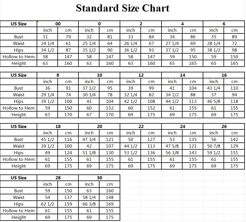 • About Size:Please refer to the last image about size chart,choose one size fits you,if between two sizes,please choose one larger.You can also send us your measurements of bust,waist,hips and height,the tailor will customize the dress fits you.