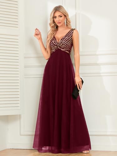 Women Sequin Maxi Formal Evening Party Dresses Glitter V Neck Empire Waist Sleeveless Tulle Wedding Guest Dress Burgundy XL 1