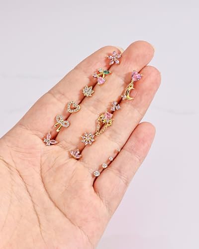 • Nose Ring Sets: Nose ring pack includes 15 pieces gold nose rings for women with pink cubic zirconia, dangle nose ring, heart nose ring, butterfly nose ring, flower nose ring, moon nose ring, cherry nose ring, bow nose piercing, leaf nose stud, classic round cubic zirconia nose piercings, effortlessly mix and match with any outfit for a fresh, trendy look every day, perfect for adding a touch of sparkle to both casual and formal styles