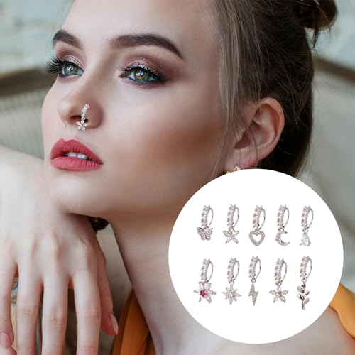 HOT ! 10 Pcs Dangle Nose Stud Rings Hoops, Copper Dainty Star Moon Heart Leaf Flower Dangle Butterfly Nose Hoop Piercing Jewelry for Women Fashion Accessories(Silver)