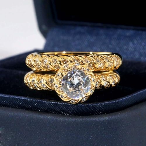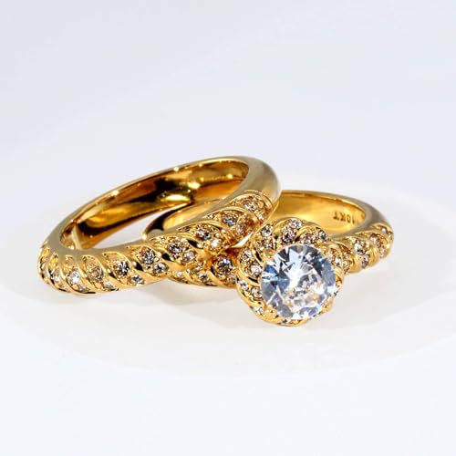 • FIT ANY OCCASION:Add style to a basic look with these couple ring.The classic yellow gold bridal set are finely crafted of gleaming aaa cz and are enhanced with a high polish finish.Womens ring set have 1ct main stone with prong setting to make it stronger and not easy to fall.Perfect for everyday wear for a statement-making look no matter the occasion.Make a dazzling addition to your jewelry collection!