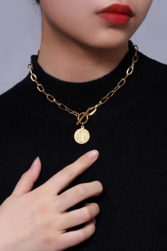 925 Sterling Silver Toggle Necklaces Women Men, 14k Yellow Gold Unisex Thick Chain Toggle Necklace - Saint St Benedict Coin Toggle Charm, OT Buckle Toggle Clasp For Christmas Birthday Gifts 1