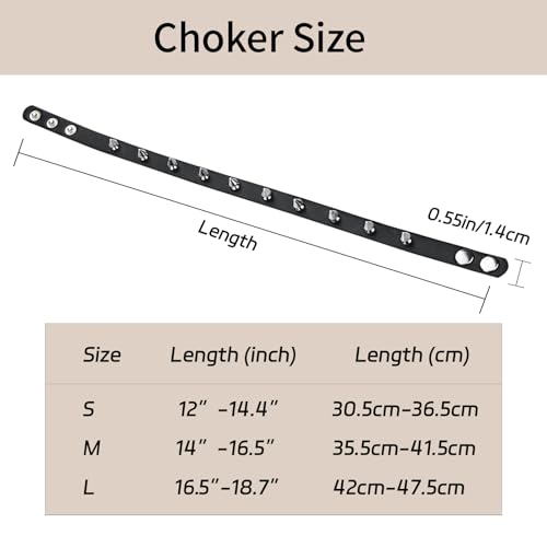 • Length: Three sizes available, S with length 12"-14.4", M with length 14"-16.5", L with length 16.5"-18.7"; Width: 0.55". Two snap buttons and three clasp settings on the choker make it adjustable for different size necks.