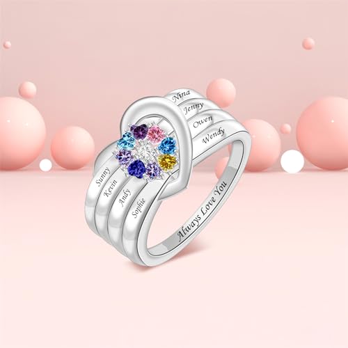 LucySky Sterling Silver Mothers Rings with 1-8 Birthstones, Heart Engagement Ring, Birthstone Ring for Her Family Jewelry Promise Ring, Size 5-12 7