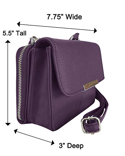 HOT ! Roma Leathers Mini Leather Cross Body Purse - Premium Purple Embossed Cowhide Leather - Backside Detachable Wallet - Adjustable and Removable Shoulder Strap - Designed in USA