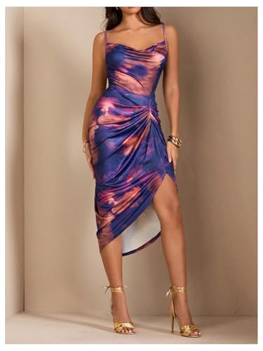 More information about WDIRARA Women's Tie Dye Sleeveless Bodycon Midi Dress Cowl Neck Ruched Split Cami Dresses