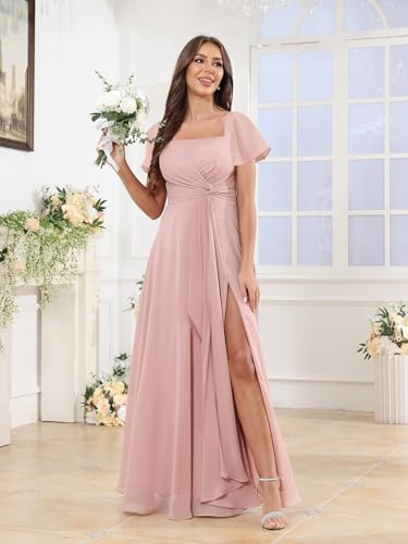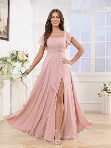 Square Neck Chiffon Bridesmaid Dresses for Women with Sleeve Long Ruffle A-Line Formal Party Gowns with Slit 1