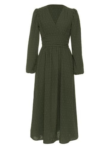 HOT ! Mettclasi Women's Spring Fall Swiss Dot V Neck Maxi Dress Casual Puff Long Lantern Sleeve A-Line Flowy Dress