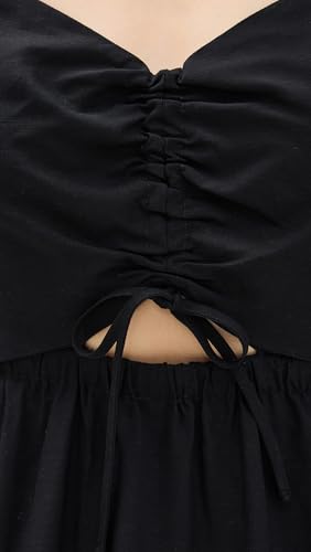 • Smocked elastic panel at back, Ruffled hem, Adjustable ruching ties at bodice, Cutout at waist
