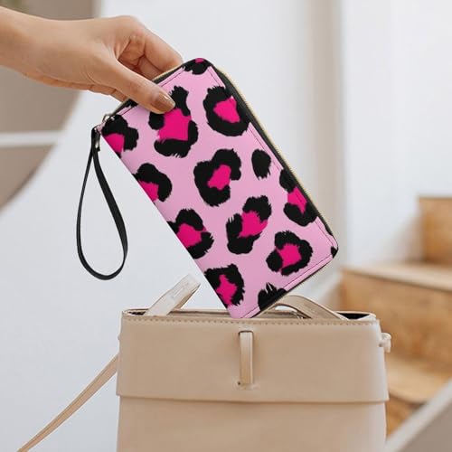 Women's Travel Zipper Purse Fashion Design, Huge Storage Capacity Purse, Cute Decor Wallet, Long PU Wallet With Rope Pink Cheetah Leopard Print 1
