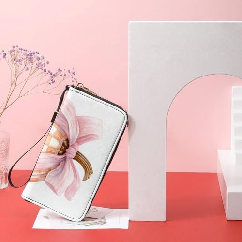 Round Pumpkin with Pink Bow PU Leather Clutch Long Bifold Wallet, Coin Purse Credit Pass Case, Durable Card-Holder Money Storage for Women Men 6